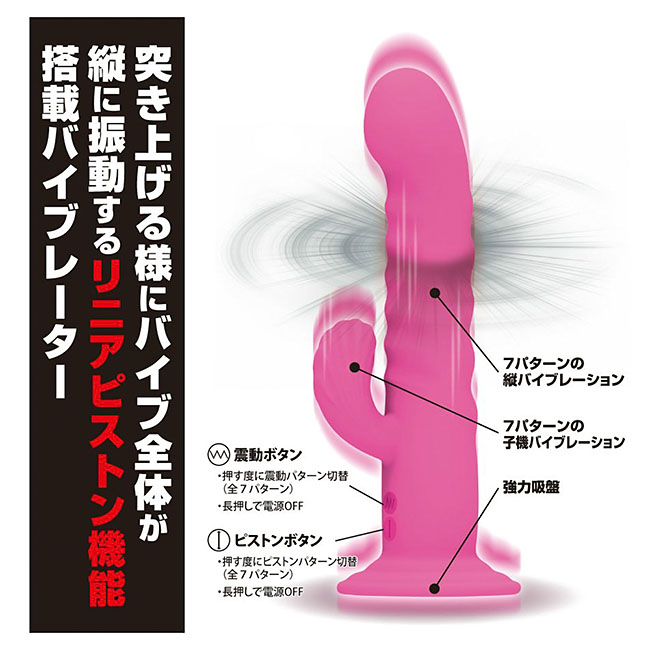 リニアピストン搭載バイブ ズンズンと突き上げるようにバイブ全体が縦に振動するリニアピストン機能を搭載したバイブ「プリティラブ アッパーカット」。奥の奥まで響く快感刺激が味わえるハイクオリティバイブです。通常、ピストンバイブといえば、本体が伸縮することでピストン機能を生み出しますが、このバイブは内部をピストンさせることで、ズンズンと突き上げる刺激により、快感を得ることができます。ピストンと連動したバイブレーション機能も搭載されており、中だけでなくクリトリスもしっかりと刺激してくれる仕上がりになっています。本体の素材は、肌触り抜群の高品質シリコンコーティングが施され、挿入感も抜群。本体底部には強力吸盤も施されているので、床や壁に固定したプレイも可能。生活防水機能も搭載した、ハイクオリティの次世代バイブです。