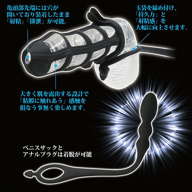 サックとアナルプラグのセットアイテム メッシュ状のサックとアナルプラグがセットになった、男性のための快感アイテム「PAアシストギア」。サックは、肌を露出させたデザインになっていて、挿入感や適度な快感を損なうことなくお楽しみいただけます。そして、サック部分からつながったアナルプラグは、サック装着後にそのままアナルへ挿入することができます。このプラグは電動式で7段階の振動パターンを搭載。これを挿入することで、前立腺を刺激させて射精感を大幅アップさせてくれます。また、玉を締め付けるリングも付いた優れもの。サックのおかげで挿入時間は長くなり、プラグやリングの効果で射精感をアップするという、男性にとっては夢のようなアイテムです。