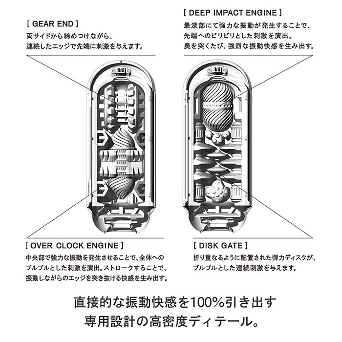【OVER CLOCK ENGINE】 中央部で強力な振動を発生させることで、全体へのブルブルとした刺激を演出。ストロークすることで振動しながらのエッジを突き抜ける快感を生み出す。 【DISK GATE】 折り重なるように配置された弾力ディスクがブルブルとした連続刺激を与えます。 【DEEP IMPACT ENGINE】 最深部にて強力な振動が発生することで先端へのビリビリとした刺激を演出。奥を突くたびに強烈は振動快感を生み出す。 【GEAR END】 両サイドから締め付けながら連続したエッジで先端に刺激を与えます。
