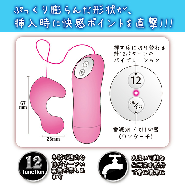 中イキ推奨!超快感ローター! 「膣の中でイク!」中イキに特化したシリコン製ローターとなっております。人間工学に基づいて設計された本体が膣にピッタリとジャストフィットします。ぷっくりと膨らんだ先端がぽっこりと膣に入り、Gスポットを刺激、中盤がクビレているので、スルスルと奥まで挿れることができます。もちろん乳首やクリトリスなどに押し当てによる振動刺激も可能で、振動は12パターンを搭載しており、様々な快感をお楽しみ頂けます。生活防水仕様なので、使用後は丸洗い可能でお手入れもラクチンです。中イキ派はもちろん外イキ派の方もクセになっちゃうイキローターとなっています。外イキに特化した「外イキローター」も同時発売中!
