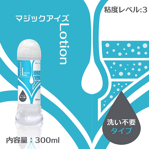 マジックアイズから使いやすいローションが登場!新成分「ヒドロキシエチルセルロース」(粘度を高める成分)を配合したローションです!その他に化粧品に使われる成分を配合しているので、お肌に優しく安心安全となっています。粘度は少し硬めのベトさら系です。さらに使用後にはサッと拭き取るだけでスッキリ処理できる洗い不要となっているので、終わった後にそのまま眠りにつけるというこの上ない幸せな体験が可能となっています!内容量:300ml