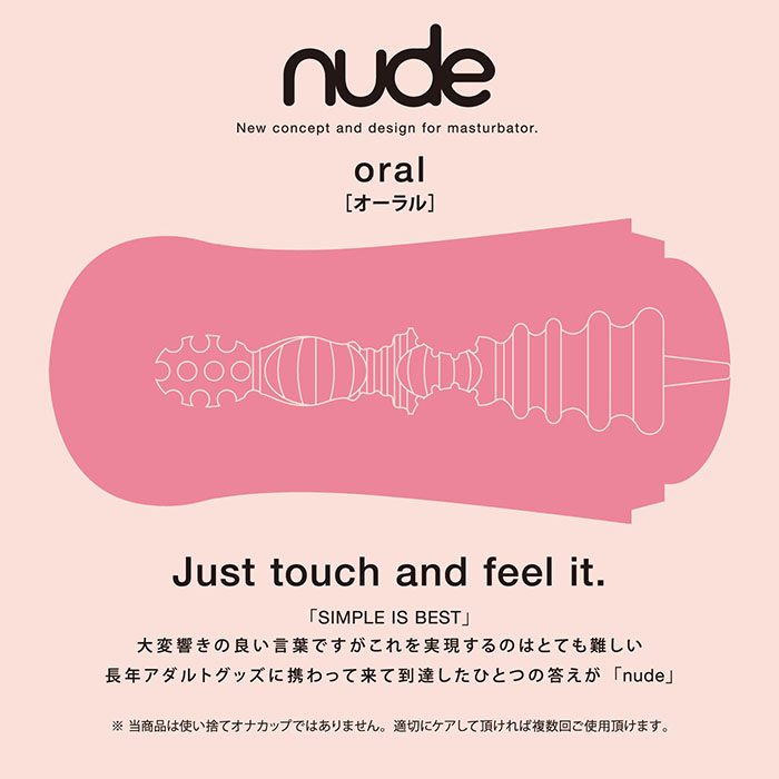 長年の研究から生み出した「SIMPLE IS BEST」ホール 「SIMPLE IS BEST」大変響きの良い言葉ですが、これを実現するのはとても難しい。長年アダルトグッズに携わって来て到達したひとつの答えがこちらの「nude」。オナホールの原点、オナカップの源流を徹底追求した至極の逸品です。タイプは、「アナル」「ヴァギナ」「オーラル」の三種類を同時にご用意しました。お好みの穴を楽しむのもよし、全ての穴を堪能するもよし、オナホールの原点を知るためには一度は通っておきたい穴となっています。こちらの「オーラル」は、挿入口付近の横ヒダで舌のザラザラ感を出し、さらに中腹と奥は大きなコブで口蓋垂と咽頭を表現し、リアルなオーラルセックスを体感していただけます。形状はオナカップと同様ですが、使い捨てではなく丁寧にお使いいただくことで複数回の使用が可能です。コスパにも優れたオナホールの原点、アナタは試してみたくないですか?
