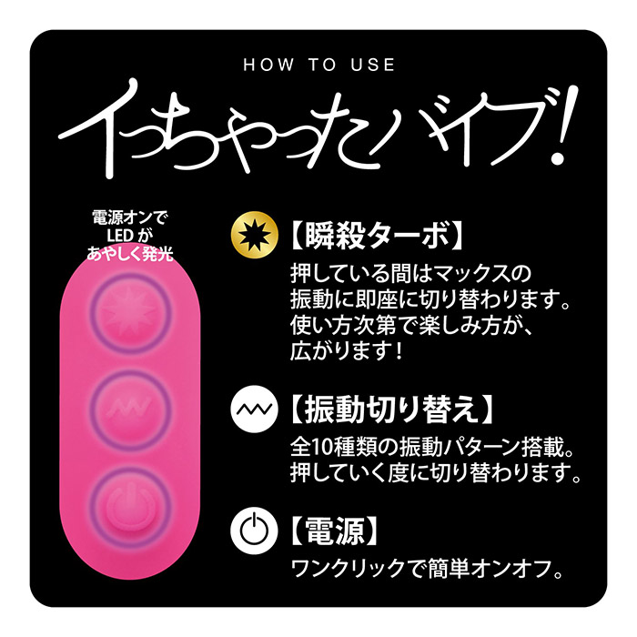 「瞬殺ターボ」機能で瞬時にオーガズムへと導く! あの人気AV女優桜木凛ちゃんがイッっちゃった!?可愛い見た目とは裏腹にクセの強い快感バイブ「桜木凛がイっちゃったバイブ」。しっとりとした質感の高品質シリコンを採用し、継ぎ目ができないように包み込んだ体に優しい仕上がりです。操作は、10パターンの振動モードを搭載しており、飽きのこない使用感が味わえます。さらに、このバイブの特徴として「瞬殺ターボ」機能を搭載。スイッチの一番上部にあるボタンを押している間、即座に最大振動レベルへと切り替わってくれます。最大振動が楽しみたくてもいちいちボタンを押していたのでは楽しめません。そんな悩みを解消する「瞬殺ターボ」機能。この機能があるだけで十分に楽しめる一本となっています。