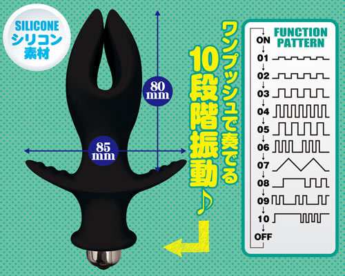 開脚式のシリコンアナルプラグ昨今流行りのアナル責めアイテム。先端の開いた口を閉じてアナルにねじ込めば、挿入後に開花されアナル拡張をスムーズに行います。さらに、このアナルプラグは電動仕様となっており、本体底部のスイッチを押すごとに10段階の振動パターンが変化します。高級シリコンを採用し、滑らかな挿入を促してくれます。アナルが破壊されるほどの強力な拡張に振動機能をプラスした、恐ろしいほど逞しいアナルグッズです。有効挿入部:8.0cm開脚時最大径:8.5cm電池:単4×1本パッケージサイズ:25.0×13.0×5.0cmカラー:ブラック