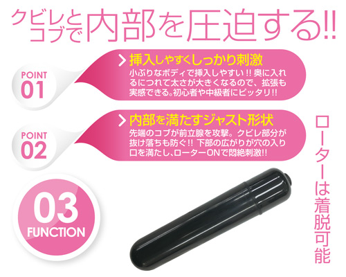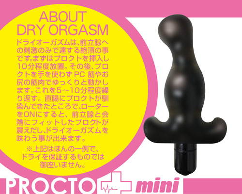 スムーズな挿入を可能にしたミニアナルプラグ「プロクトミニ」。ミニタイプだからアナルへの負担が少ない状態で挿入することができます。根元にいくにつれて徐々に太くなる形状なので無理せず自分のペースでアナル責めを行うことができます。また、本体底部には脱着可能なローターを搭載。振動による前立腺への刺激で、射精感のアップやドライオーガズムを促してくれます。ローターが脱着できるので、洗浄も楽に行えて、いつでも清潔にお使いいただくことができます。ミニタイプで初心者のアナル開発をサポートするアイテムです。