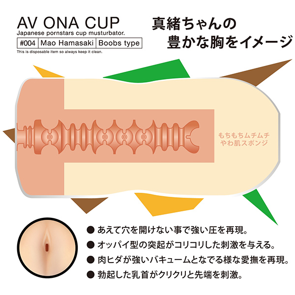 AV女優がカップホールとコラボ! アダルトグッズメーカーと人気AV女優のコラボレーション商品として、「浜崎真緒」ちゃんのオナカップが登場しました!真緒ちゃんの豊満な胸をイメージしたオナカップ内部はおっぱい型の突起がコリコリと亀頭やサオを刺激し、肉ヒダが強いバキュームと撫でるような愛撫を表現しています。奥には亀頭を待ち受けるようにおっぱいが配置されており、乳首が亀頭を擦り付け刺激します。オナカップの底面にある空気穴をあえて開けないことにより、強い圧を再現することに成功しました。真緒のおっぱいを息子に感じながらオナニーに耽っちゃってください!