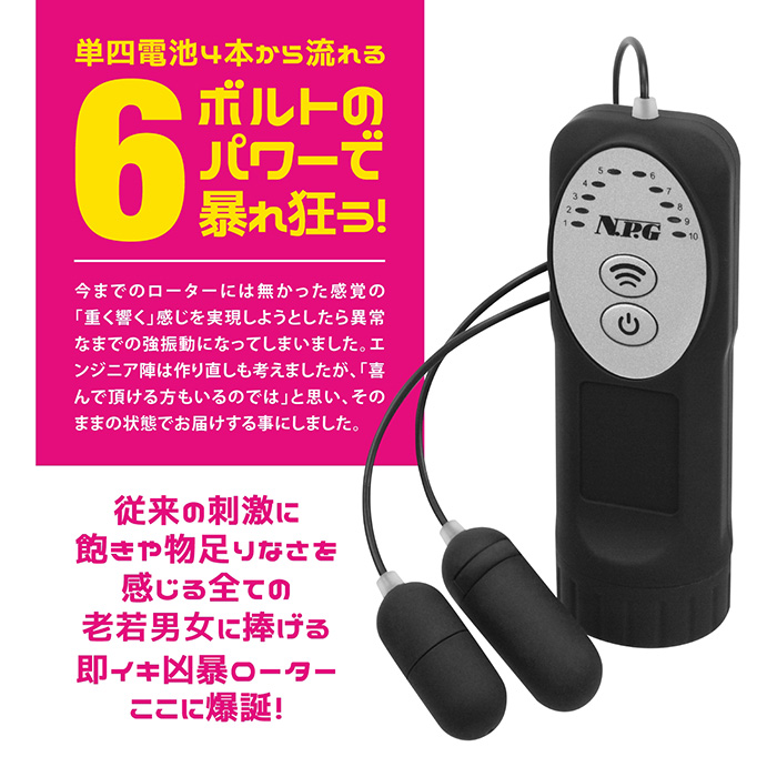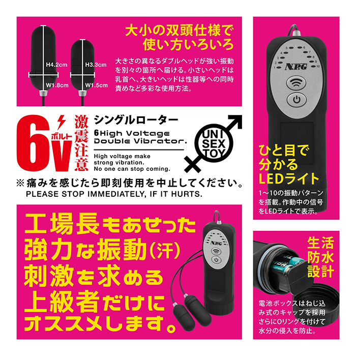 振動レベルは最高峰!激震ローター 開発者も驚愕の強振動を搭載した激震ローター「取扱注意 6ボルト ダブルローター」。今までのローターではなかなか実現し辛かった「重く響く」感覚を再現するために誕生しました。このローター、あまりにも振動が強すぎたため、開発者も作り直しを考えたほどです。しかし、これだけの強振動もユーザーには必要かと考えた末、販売に至りました。操作は10段階の振動パターンを搭載しており、強力かつ飽きのこない使用感となっています。リモコン本体には振動パターンが一目でわかるLEDライトを搭載しました。また、ダブルロータータイプとなっていて、それぞれ大きさの違うローターを採用しているので、使うポイントを分けながらあらゆる性感帯へ刺激を与えることができます。生活防水機能も施しているので使う場所を選ばず、いつでもどこでもお使いいただけます。本物の振動を体感するべく開発された最強にして最高のローターです。
