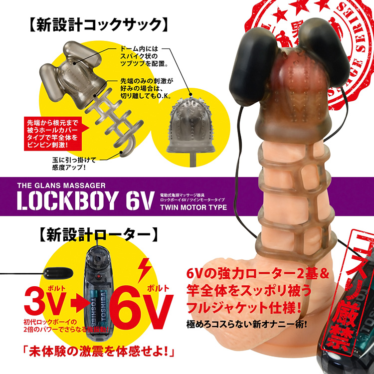亀頭を完全ロックして徹底的に責め立てる! 亀頭への振動刺激のみで射精へと導いてくれる亀頭責めアイテム「ロックボーイ」。さらなる振動の高みを追求するべく、6Vの電力でハイパワー性能を発揮してくれます。亀頭キャップはしっかりと亀頭に固定されるようにデザインされていて、そのキャップにローターを取り付けるだけでOK。また、竿を締め付けるサックがあるので、締め付け効果による射精感アップも期待できます。操作は、ダイヤル式の無段階強弱調節が可能なローターを採用。取り扱いしやすいので、手軽に亀頭責めを楽しむことができます。全方位から男性器をサポートしつつ刺激を与えてくれる亀頭責めアイテムです。
