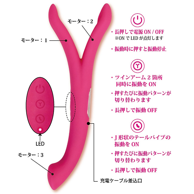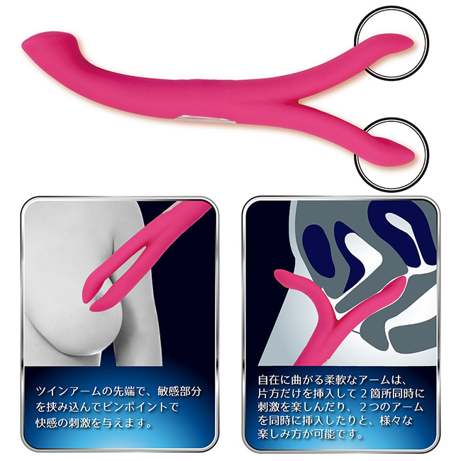 2又に分かれた先端と根元で即イキ!3分以内のアクメ率92%という驚異の即イキバイブレーター「シークレットガーデン トライ」!シリコン製の柔らかな質感で肌触り抜群のユニークな形状をしたバイブで、ツインアームの先端とテールバイブの先端の計3つの高性能モーターを搭載しています。ツインアームは柔軟に曲がるので、片方を膣に挿入して片方はクリトリス周辺を同時に刺激することもでき、乳首を挟みこんで刺激したりなど、アイデア次第で多彩な使い方ができます。またカーブを描くテールバイブはGスポットにフィットして、ダイレクトに振動を伝えることができます。振動パターンは8種類となっているので、その形状を活かした多彩なアプローチでリズミカルな振動をお試しください!本体サイズ:27.0×Φ3.7cmツインアーム:9.0×Φ3.1cmパッケージサイズ:29.6×9.0×4.7cm重量:210g電池:USB充電式(コード付属)