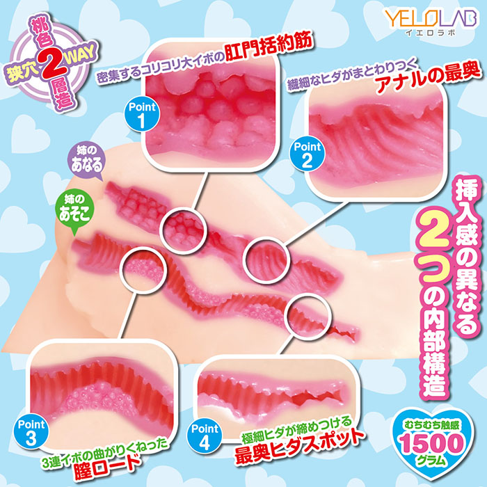 スカート付きのリアルなオナホール! スカートを履いたセクシーな姉の生尻を堪能できるオナホール!ソフトプリーツスカートがひらりとそよいで露わになったエロいお尻が深い没入感を実現。ヴァギナとアナルの2穴構造で素材は素肌に近い質感となっています。穢れを知らないアソコは未成熟ですが、ミミズ千匹という名器を備えており、3連イボが曲がりくねった膣ロードと細かいヒダが締め付けるヒダスポットを味わうことができます。もちろん何も頬張っていない未貫通のアナルはキツキツの引き締まった括約筋が竿をキュッと締め付け、コリコリの大イボと繊細なヒダが絡みつく感触を楽しめます。外側と内側で弾力と肌触りの違う2WAY早熟2層構造がリアルな粘膜感を再現しています。非貫通タイプなのでバキューム効果も期待でき、空気を十分に抜くことでより深いバキュームを発揮します。手持ちでも据え置きでも安定して使える造形で、セクシーなお尻を思う存分楽しんじゃってください!