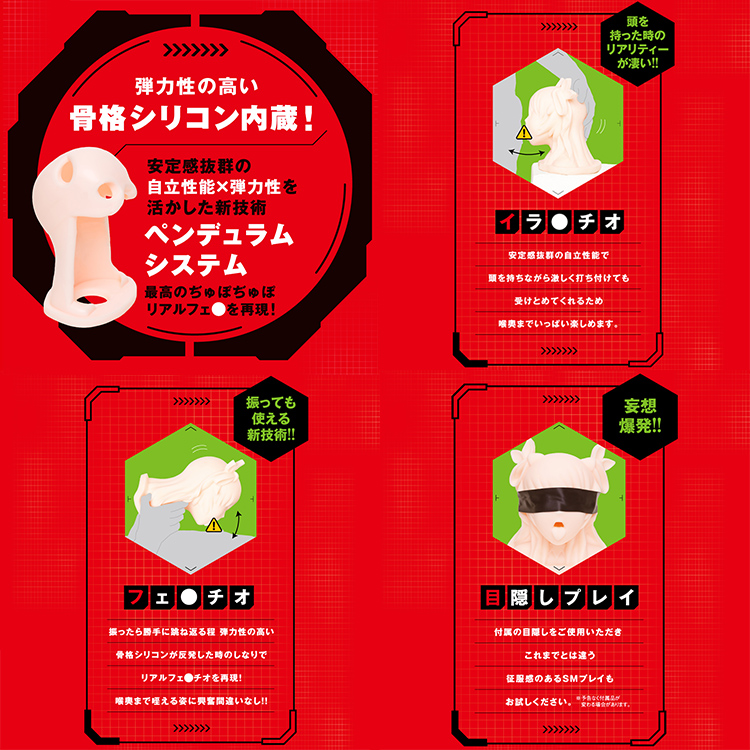 リアルな頭部がジュポジュポと舐めながら揺れる 超重量約3kgの水城ゆきかぜフェイスフェラホールが誕生しました。頭蓋骨形状の骨格シリコン内蔵で安定感抜群の自立型オナホールです。弾力性の高いシリコンを利用した新技術として、振ったら勝手に跳ね返る「ペンデュラムシステム」で、ぢゅぽぢゅぽしゃぶり尽くす超絶リアルフェラチオを体感していただけます。置いても使えて、振っても使える使い勝手抜群のアイテム。付属の目隠しをご使用いただき、征服感たっぷりのSMプレイも楽しめるオナホールです。