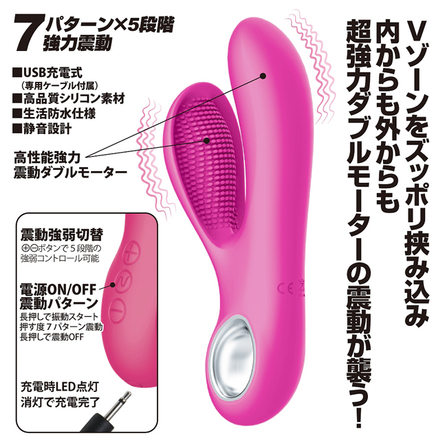 「ピンチングバイブレーター」は本体と細かいブラシの付いた子機に高性能モーターを搭載しており、Vゾーンをスッポリと覆い込んで中と外から挟みこむように刺激します。7パターン×5段階の振動機能を搭載しているので、刺激に慣れる前に絶頂へ達すること必至です。高品質シリコンで覆われたボディは安全面でも優れ、生活防水&静音設計で場所を選ばずにお使い頂けます。