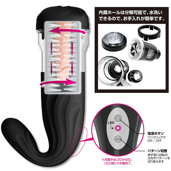 「アルティメットオナミキサー」はブラックで統一された高級感のある電動オナホールとなっております!オナホールの挿入口はヴァギナ形状となっていて、内部はイソギンチャクのような無数の触手が張り巡らされており、ボディの下部にあるスイッチを押すことによりオナホールが大回転して、亀頭に触手がローリングしながらニュルニュルと絡みついてきます。さらに上下のピストン運動を同時に展開され、竿全体を包み込んでリアルではなかなか体験できない強烈な快感を味わうことができます。ローリング&ピストンには4パターンの切替が可能で、飽きることのない刺激を楽しめます。オナホールは取り外しが可能で、分解して水洗いもできるのでお手入れも簡単です!