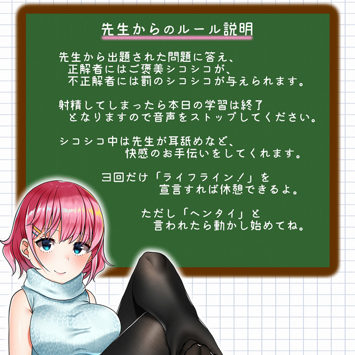 音声とシンクロする快感ホール 勉強中にどうしてもムラムラしてしまい鉛筆ではなく自らの竿を握ってしまい、オナニーは捗りますが勉強が捗らない日が度々あります。そんな時は逆にオナニーを勉強に活用するという目から鱗的な発想のオナニー学習メソッド「音声でオナホ スタディシコシコ1年生」が登場しました!エロい先生の声に従いながら一般常識を学べます。出題される問題に正解できればご褒美シコシコが与えられ、不正解だと罰のシコシコが与えられます。勉強に使うオナホールはクリアボディの非貫通タイプで内部が逆三角形ヒダとなっています。気持ち良く勉強できるオナニー学習を是非取り入れてみてはいかがでしょうか!