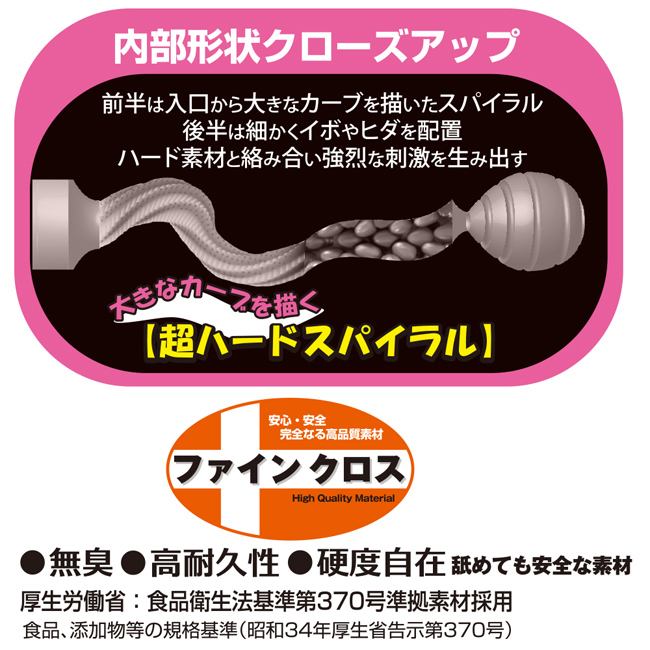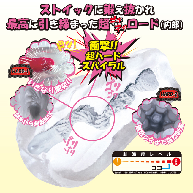 キツキツのハード素材で圧倒的締め付け体験! キツキツの極上ハード構造に拘った刺激系ホール「極キツハード 自転車女子」。ストイックに鍛え抜かれ、最高に引き締まった超ギチギチロードを体感することができる唯一無二のオナホールです。内部は、そのギチギチ感を余すことなく表現した構造になっています。挿入直後いきなりスパイラル構造があり、膣壁に採用された無数のヒダが絡まりながら高刺激を与えてくれます。その先には、絶妙な大きさのイボ突起が無数に張り巡らされていて、そこでストロークするたびに亀頭がゴリゴリと刺激される快感が味わえます。最深部はエアポケットがあり、バキューム効果を生み出すことで更なる高刺激を実現。最初から最後まで、刺激たっぷりのオナホールとなっています。