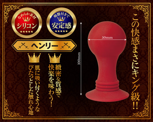 アナル上級者に捧げるアナルグッズ! アナルグッズの頂点(キング)と呼ぶにふさわしい、立派なフォルムを施したアナルグッズ「アナルキング」。高級感のあるなめらかシリコン素材を採用し、本体の色もワインレッドで仕上げました。こちらの「ヘンリー」は、直径5.0cmのまさにキングサイズプラグ。ツルンとした球体型のデザインで、挿入の妨げになるものはなく、アナタのアナルへ向けて一直線に進んでくれます。本体底部には吸盤が施されているので、床などに固定しながらプレイすることも可能です。滑らかな触り心地でアナタのアナルプレイを充実させてくれるキングの名にふさわしいアイテムです。