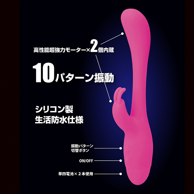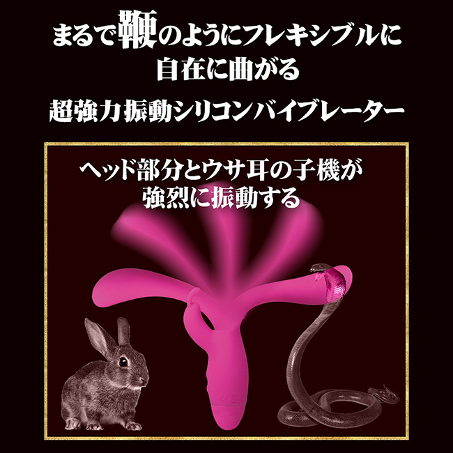 子機バイブを搭載したフレキシブルバイブ 本体のコブラと子機のうさぎが向かい合うように対峙した形状のバイブレーター【コブラ vs ラビット】!本当のコブラとうさぎだったら、どう考えてもうさぎの方が分が悪いだろうと思いますが、これがバイブになるとうさぎも負けてはいません!2本の長い耳を使って繰り出される強振動はピンポイントにクリトリスや乳首などの快感スポットを捉え、微細な振動を挟み込むように余すことなく伝えます。本体のコブラはスリムなボディでフレキシブルに曲がり、スルッと挿入が可能で、ぷっくりと膨らんだ先端がGスポットを的確に捉えて振動を伝えます。どちらかといえば「VS」というよりも、Gスポットとクリトリスを力を合わせて責め立てるバイブとなります。どちらにもモーターが搭載されていて、振動パターンは10種類と豊富。生活防水機能搭載でお手入れも簡単にでき、場所を選ばずにプレイできちゃいます!