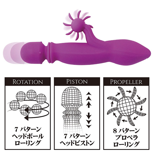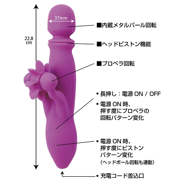 ピストンと回転式子機が融合した斬新バイブ メタルパール回転、ヘッドピストン、プロペラ回転など多彩な機能で女性を快感のあまり昇天させるバイブレーターとなっています。まずは本体のヘッドに内蔵されたメタルパールが回転してGスポットを刺激。さらにヘッドが激しくピストンして奥のポルチオを責めたてます。子機にはプロペラ状のクリバイブがあり、フレキシブルに曲がるのでクリトリスにフィットしながら、大回転して愛撫します。ヘッドピストンとメタルボール回転は7パターンの切替が可能で、プロペラの回転は8パターンの切替が可能となっています。強力なモーションながらもシリコン素材の柔らかな愛撫が激しいながらも心地よさを提供してくれます。さらに生活防水機能も付いている機能性の高いアイテムとなっています!
