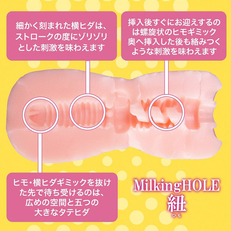 極細の内部構造でしっかりと締め付ける 螺旋状の紐が激しく絡みつく紐ギミックを採用した非貫通タイプのオナホール「ミルキングホール 紐[ヒモ]」!挿入口は幾多のテイスティングを繰り返してスムーズな挿入と適度な締め付け感を実現。全体に刻まれた表面のモールドは激しいピストンでも手滑りすることなくフィニッシュまで到達することができます。内部構造は挿入口のローション溜まりを越えた先にあるこのホールのキモである螺旋状の紐ギミックが竿に絡みつきヌルヌルとした快感を与え、その奥にある細かく刻まれた横ヒダはゾリゾリと亀頭を擦りつけてしっかりとした刺激を与えます。最奥に待ち受けるのは広めの空間に施された5本のタテヒダで、先っぽをチロチロと舐めるように舐ります。非貫通タイプの長所であるバキューム効果と確実に精子を搾り取るように設計された搾精(ミルキング)構造の併せ技で、絶頂への最短経路を突き進むこと間違いなしです!