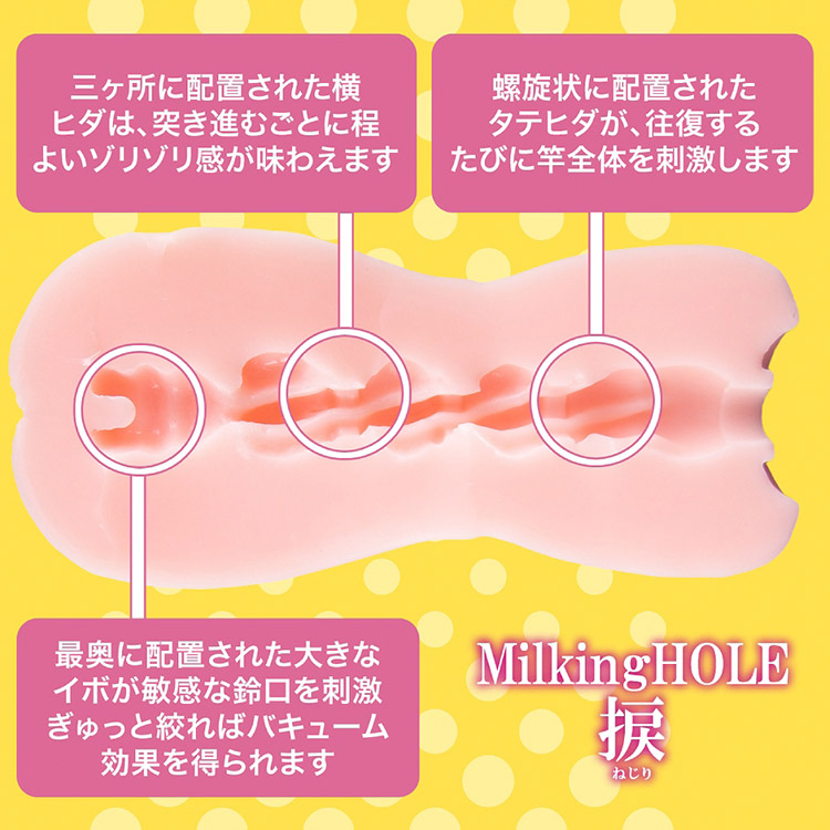 極細の内部構造でしっかりと締め付ける 螺旋状に配置されたタテヒダがブラックホールのようにペニスに絡みついて離さない非貫通タイプのオナホール「ミルキングホール 捩[ネジリ]」!挿入口は幾多のテイスティングを繰り返してスムーズな挿入と適度な締め付け感を実現。全体に刻まれた表面のモールドは激しいピストンでも手滑りすることなくフィニッシュまで到達することができます。内部構造は螺旋状の捻じれたヒダが配置され、絡みつきながら奥へ奥へと誘い込みます。この時3カ所に設置された横ヒダがゾリゾリとした刺激を与え、最奥に配置された大きなイボが尿道を嬲るように刺激します。非貫通タイプの長所であるバキューム効果と確実に精子を搾り取るように設計された搾精(ミルキング)構造の併せ技で絶頂への最短経路を突き進むこと間違いなしです!