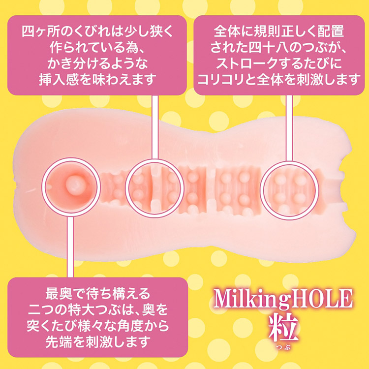 極細の内部構造でしっかりと締め付ける 四方八方ツブだらけの内部構造を持つ非貫通タイプのオナホール「ミルキングホール 粒[ツブ]」!挿入口は幾多のテイスティングを繰り返してスムーズな挿入と適度な締め付け感を実現。全体に刻まれた表面のモールドは激しいピストンでも手滑りすることなくフィニッシュまで到達することができます。ホール内部にびっしりと配置された48個のツブがペニス全体をコリコリとした刺激を与え、4カ所にあるクビレは押し広げるような挿入感を味わえます。最奥では2つの大きなツブが先っぽを擦るように刺激します。非貫通タイプの長所であるバキューム効果と確実に精子を搾り取るように設計された搾精(ミルキング)構造の併せ技で絶頂への最短経路を突き進むこと間違いなしです!