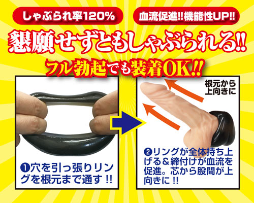 元気よく反り返る逞しい姿に、しゃぶらずにはいられない! おもわずしゃりついてくれる!しゃぶられずにはいられない!しゃぶられ率120パーセントのフェラ専用リング「フェラリング」。リングを根元に装着することで、リングの支えによってイチモツ全体が上向きになってくれます。そんなギンギンな様を見せつけたら、あとは勝手にしゃぶりついてくれるのみ。反り返りが逞しく、フェラする側も楽に行うことができます。また、リングの締め付け効果により持続力、勃起力もサポート。逞しさを見せつけるために誕生したフェラ専用リング。アナタの立派なイチモツにくぎ付けになること間違いなし。