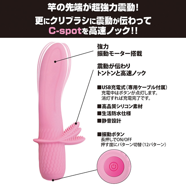 子機がクリトリスを激しくノックする! おしゃれで他にない機能を搭載した「プリティラブシリーズ」!今作は本体の先端に強力な振動モーターを搭載しており、その強力な振動が軟質素材の子機まで伝わり、激しく上下に揺れてクリトリスをノックします。子機にはブラシのように細かいツブが配置されているので、ツブツブの刺激も併さって微細でピンポイントな振動刺激を与えます。振動パターンは12種類と多彩で、ボディは高品質のシリコンで覆われているため、強力な振動でも肌触りが良く安全です。さらに生活防水機能と静音機能が付いていて多機能で高機能な満足度の高いグッズとなっています!