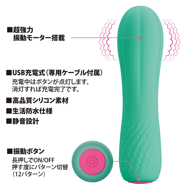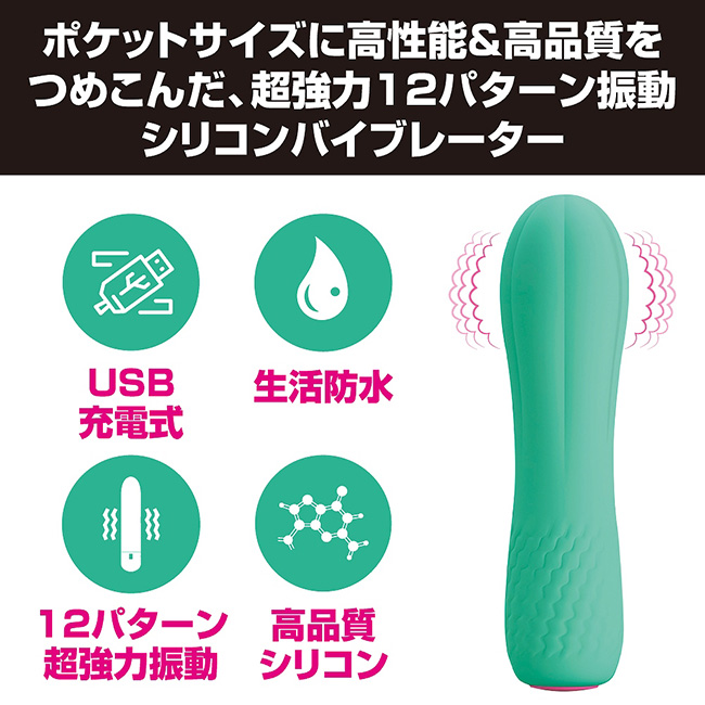 手のひらサイズの強力振動バイブレーター! おしゃれで他にない機能を搭載した「プリティラブシリーズ」!そのプリティラブからポケットサイズの1本型シリコンバイブレーターが登場しました。小さなボディには超強力振動モーターが内蔵されていて、12パターンの振動刺激を楽しむことができます。コンパクトなのでそのボディを活かしスムーズな挿入はもちろんクリトリスなどの快感スポットに当てて振動を楽しむこともできます。さらに生活防水機能と静音機能搭載で場所を選ばずに使うことが可能で、旅行や出張の際にカバンやポケットに忍ばせればいつでも気持ち良くなることができちゃいます!