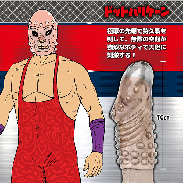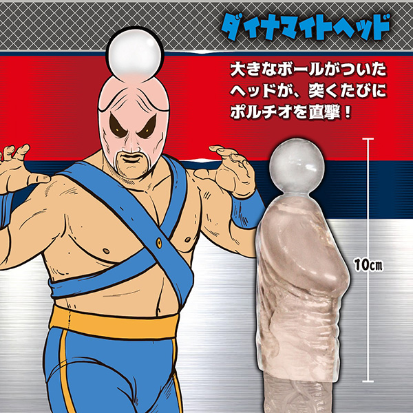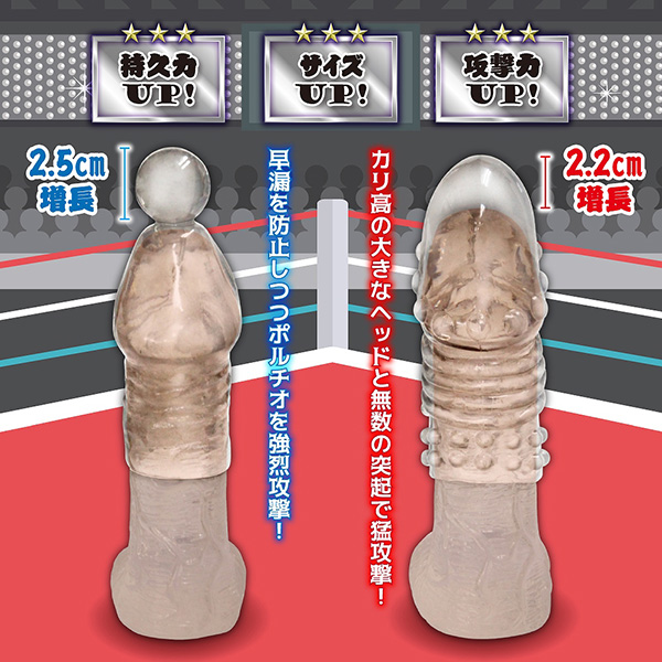 それぞれ異なった形状と効果のリング2個セットです!それぞれに名前がありダイナマイトヘッドと呼ばれるサックは先端に大きなボールのような膨らみがあり、ピストンする度にポルチオを直撃する攻撃力の高いサックとなっています。ドットハリケーンは先端に厚みがあり持続力を高め防御に徹し、所々に設置されたイボ突起で徐々に刺激していきます。場面によってマスク(サック)の付け替えを行うことで有利に戦いを進めることができます。亀頭タッグマッチで亀頭のパフォーマンスを上げて、夜の試合を大いに盛り上げろ!
