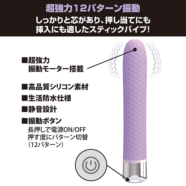 ポルチオまで届くスマートボディ おしゃれで他にない機能を搭載した「プリティラブシリーズ」!ストレート形状のバイブで先端に強力モーターを搭載した「プリティラブイージースティックロング」。スマートさと長さを備えたボディを活かしスムーズな挿入からポルチオへの刺激はもちろん、クリトリスなどの快感スポットに当てて振動を楽しむこともできます。12パターン振動でリズミカルな刺激を与えることができます。高品質シリコンを採用しているので弾力があり、お肌にも優しく安心安全。さらに生活防水機能と静音機能搭載で場所を選ばずに使うことが可能で、旅行や出張の際にカバンやポケットに忍ばせればいつでも気持ち良くなることができちゃいます!もう少し短い方がイイという方はイージースティックミニを推奨します!