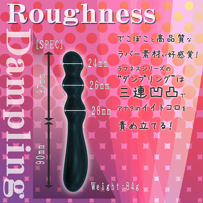 ソフトな肌触りが優しい快感を与えてくれるソフト素材で初心者から上級者まで楽しめるスティックディルド。電動ではないので、使用後のメンテナンスに優れており、いつでも清潔にお使いいただけます。こちらの「ダンプリング」は、吸いつくような三連凸凹がもちもちとした感触でやみつきに。ラバーと三連の凹凸の相性の良さを実感してください。本体サイズ:18.7×Φ2.8cmパッケージサイズ:20.0×5.4×4.3cm