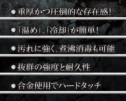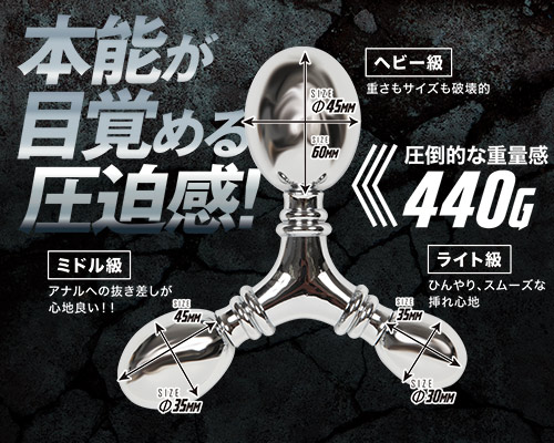 アルミニウム合金製のアナルプラグ 圧倒的な重量感とひんやりとした挿入感が楽しめるアルミニウム合金製のヘビー級アナルプラグ。プラグとストッパーは取り外しが可能となっていて、メンテナンスや保管に大変便利です。こちらの「トリプル」は、サイズの異なる3つのヘッドが特徴的。段階的に拡張することができ、小さいプラグから徐々に拡張を行えば、最終的には怪物級の圧迫感が楽しめること間違いなし!怪物級の圧迫感をとくとご堪能ください。