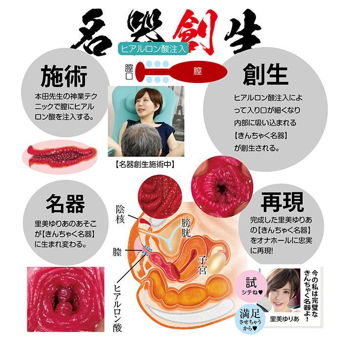 AV女優のアソコを職人が忠実に再現! 真摯に匠が名器創りに取り組んだプロジェクト。幻の【きんちゃく名器】創生。本田先生、本気(ガチ)で真摯にやってくれました。性器美容外科のカリスマ・本田ヒルズタワークリニックの総院長・本田昌毅先生の施術によって里美ゆりあのあそこは【きんちゃく名器】にアップグレード。その名器をオナホールに完全再現。10万人に1人の巾着名器。膣口から3〜4cmの場所が【きんちゃく】で絞られたように狭くなっているので挿入すると、根元をがっちり挟むかたちになるのが特徴。希少な名器ですが、本田先生の施術で膣の入り口から3〜4cmの付近にヒアルロン酸を注入することで、膣の入り口の狭い巾着状の性器をすぐに作ることができます。他では味わえない下半身整形界のカリスマとカリスマAV女優のコラボレーションで創生された巾着名器ホールの感触をぜひご堪能下さい。