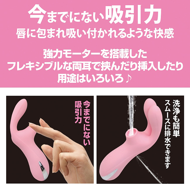 フレキシブルに曲がるバイブ本体が全ての女性のGスポットへフィットしてくれる快感バイブ「プリティラブ バキュームサッキングラビット」。本体の先端には強力モーターが内蔵されているので、Gスポットを徹底的に刺激してくれます。さらに、クリトリスに当たる部分は今までにない強力な吸引力でクリトリスをピンポイント吸引してくれます。7パターンの振動機能と、7パターンの吸引機能を搭載しており、振動と吸引は別々に操作することが可能です。また、吸引部分の汚れが気になった場合には、吸引部洗浄ボタンを押しながら直接水を流し込むことで、排水しながらキレイに洗浄することができます。しっかり洗えていつでも清潔にお使いいただけるとっても魅力的なバイブです。静音設計、生活防水機能に加え、USB充電式という、なんとも豪華な仕様となったアイテムです。