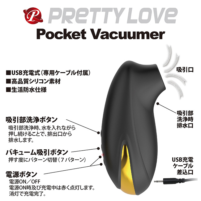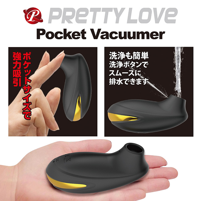 吸引機能に特化した「プリティラブ ポケットバキューマー」。クリトリスや乳首など、吸引したい箇所に当てるだけであらゆる性感帯を徹底的に刺激してくれます。吸引力も非常に強く、様々な吸引バイブがあるなかでしっかりと確立した存在感を示しています。また、この吸引バイブの注目すべき点として、吸引口に直接水を流し込んで洗浄することができます。吸引部洗浄ボタンを押しながら水を流し込むことで本体裏側から水を排出してくれて、いつでも清潔にお使いいただくことができます。操作は、7パターンの吸引機能が搭載されているので、あらゆるパターンでアナタの性感帯を刺激することができます。静音設計、生活防水機能により使い勝手がよく、USB充電式によりいつでもフルパワーでお楽しみいただけます。流行の吸引バイブに新たな1ページを刻むオススメのアイテムです。