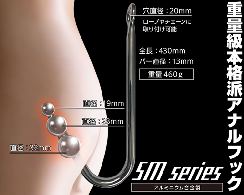 重量級本格アナルフック登場!直径32mmの衝撃がアナルを刺激する。アルミニウム合金製でずっしりとした重量感。持ち手に付いた穴にロープやチェーンを付け、アナタのインスピレーションでお楽しみください。本体サイズ:全長43.0×Φ1.9cm重量:460gパッケージサイズ:26.0×13.5×5.5cm