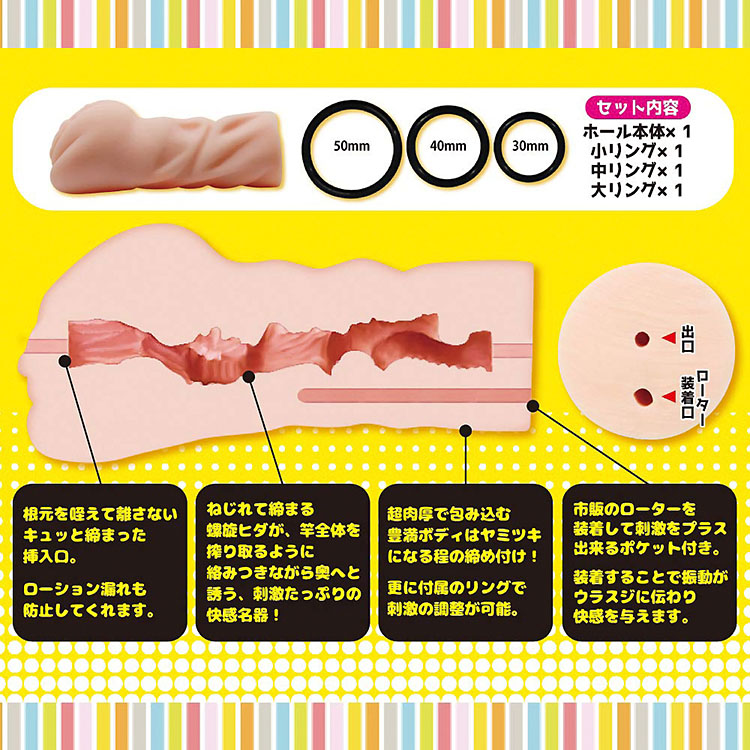 むっちり肉厚な豊満ボディを、付属の3つのリングでギュッと締め付けて引き締めMAX!内部はねじれて締まる螺旋ヒダが竿全体を搾り取るように絡みつきながら奥へと誘う刺激たっぷりの快感名器!更に、市販のローターを装着して刺激をプラス出来ちゃいます。本体サイズ:16.0×Φ7.8cm重量:445gパッケージサイズ:14.0×17.0×8.0cm