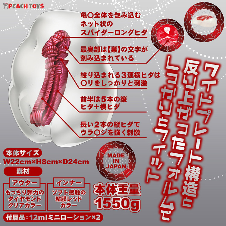 床オナ式名器シリーズに「スパイダーフィット」が登場!ワイドプレート構造と反りあがったフォルムでしっかりフィット。亀頭全体を包み込む横ヒダに、長い縦ヒダが絡みつき、ネット状のスパイダーヒダで縦横無尽に責め立てる!腰を少し動かすだけでもしっかり刺激!長期間SEXしてない蜘蛛の巣が張ったオンナノコの興奮を体験しよう!興奮度MAXのクリアボディ。スタンダードは内部が粘膜カラーの2層構造。硬さは標準。本体サイズ:22.0×24.0×8.0cm重量:1550g