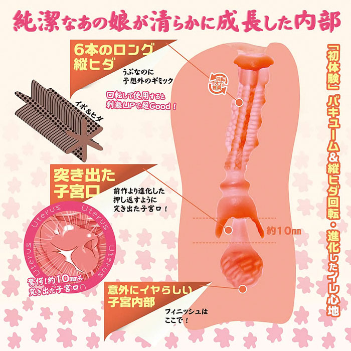 食品衛生法基準第370号準拠素材採用!純潔感がさらに進化した!!純潔なあの娘が清らかに成長した内部構造!処女膜ギミックと突き出た子宮口は今作も健在!新形状で新たな快感、そしてバキューム力アップ&超絶ギミック縦ヒダ回転!ぷりぷりのもち肌感触、ばーじんスキン!安心・安全の国内生産で素材臭と油っぽさを抑えました。本体サイズ:13.5×Φ6.0cm重量:233g