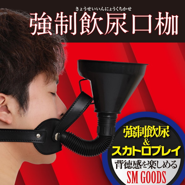 飲尿プレイ、スカトロプレイに最適なファンネル一体型マスク。少量の尿を流すもよし、思いのままぶちまけるもよし・・・使い方はあなた次第。液体受けの底には、固形物の侵入を防ぐ網もついているので、安心してご使用可能です。確実に飲尿させ、背徳感を味わわせよう。サイズ:男女兼用フリーサイズセット内容:口枷、液体受け、ノズルパッケージサイズ:15.5×14.5×14.5cm