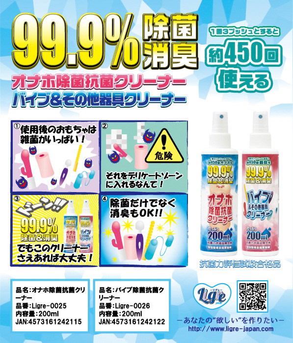 オナホ専用の除菌消臭スプレーが発売です!なんと99.9%除菌&消臭が出来る優れ物で、1回を3プッシュとすると約450回も使用できるのです!皆さん、オナホを生で使ってませんか?しかも水洗いだけでしっかり乾かしてから使用してますか?もしかしたら・・・菌まみれのホールに挿入している可能性はありませんか!?毎日使いたい大事なホール。当然メンテナンスもしっかりと安心安全な状態で使いたいですよね!公的機関にて「抗菌力評価試験」に合格している商品です。もちろん消臭除菌として、他のものにも流用は可能です!内容量:200ml
