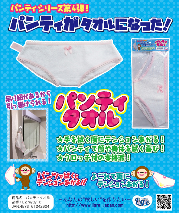 パンティシリーズ第4弾!パンティがタオルになった!!手を拭くたびにテンションあがる!これがあれば顔や身体をパンティで拭ける夢のような日々が送れます。使い込んで汚れた姿もタマラナイ!!使えば使うほど味が出て、末永く楽しめる商品になっております。パンティマニアも唸る、クロッチ付の本格派仕様。本体サイズ:14.0×34.0×0.5cmパッケージサイズ:38.0×15.4×0.8cm