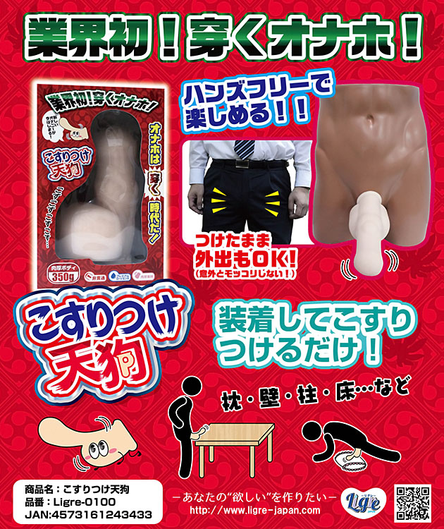 業界初!穿くオナホが誕生!!こすりつけ天狗の登場です!穿いて、布団や抱き枕、壁や床などにぐりぐりこすれる。どこにでも穿いて行けて、どこでも新しいオナニーを展開!素晴らしいのはこの密着度!計算され尽くした肉厚による自然吸着により、タマまで穿いてズレ落ちることがない!当然、中に入れるローションも溢れることなく漏れがありません!一度穿くとヤミツキになる感触と重力!とにかく上下左右にどこでもこすりつけ天狗しまくろう!!全長:16.0パッケージサイズ:22.5×14.5×9.5cm