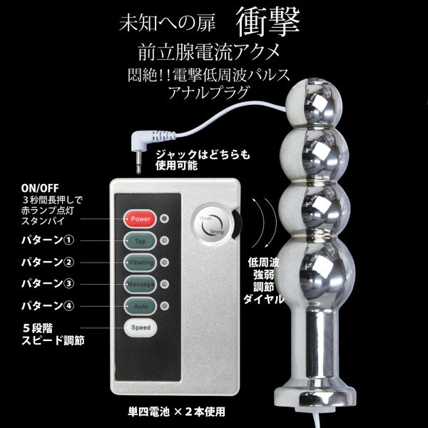 未知への扉、前立腺電流アクメ!低周波の刺激でビクンビクンと脈打つ刺激的な金属製アナルプラグ。より強い、クセになる刺激を求める方に長く愛されてきた低周波シリーズ。挿入しやすい4連玉形状だから入門者にも最適!プラグの全体から痺れる様な快感の低周波を発生させます。本体サイズ:11.4×Φ2.8cm電池:単4×2パッケージサイズ:13.5×7.0×5.5cm