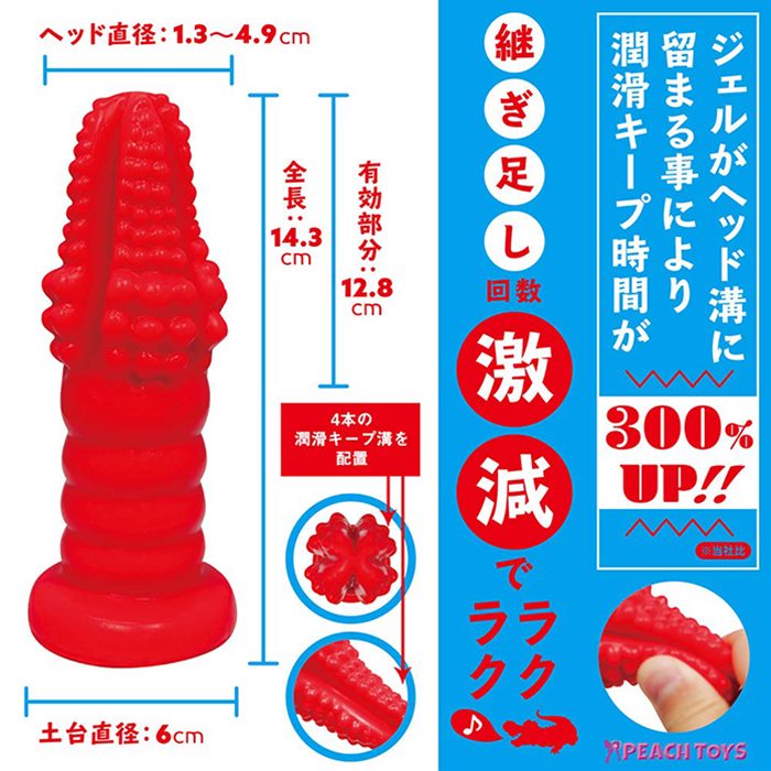 深いキープ溝を4本配置し、潤滑ローション溜まりにより、継ぎ足し回数激減。ラクラクプレイに集中できちゃいます。徐々に大きくなるワニ型ヘッドは、前半はスタートしやすい直径1.3cm、中盤はググっと押し上げる直径4.9cmとなっており、初級者から上級者まで満足できるサイズとなっております。カッチカチの硬質素材ではなく少し弾力があります。消しゴム程度の硬さのハードRED。本体サイズ:14.3×Φ1.3〜4.9cmパッケージサイズ:24.0×15.0×7.0cm