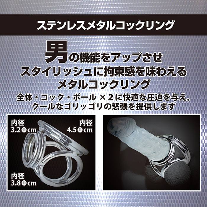 男の機能をアップさせスタイリッシュに拘束感を味わえるメタルコックリング!全体、コック、ボールに×2に快適な圧迫を与え、クールなゴリッゴリの怒張を提供します。リング内径:3.2cm、3.8cm、3.8cm、4.5cmパッケージサイズ:9.5×6.5×6.5cm