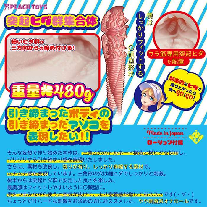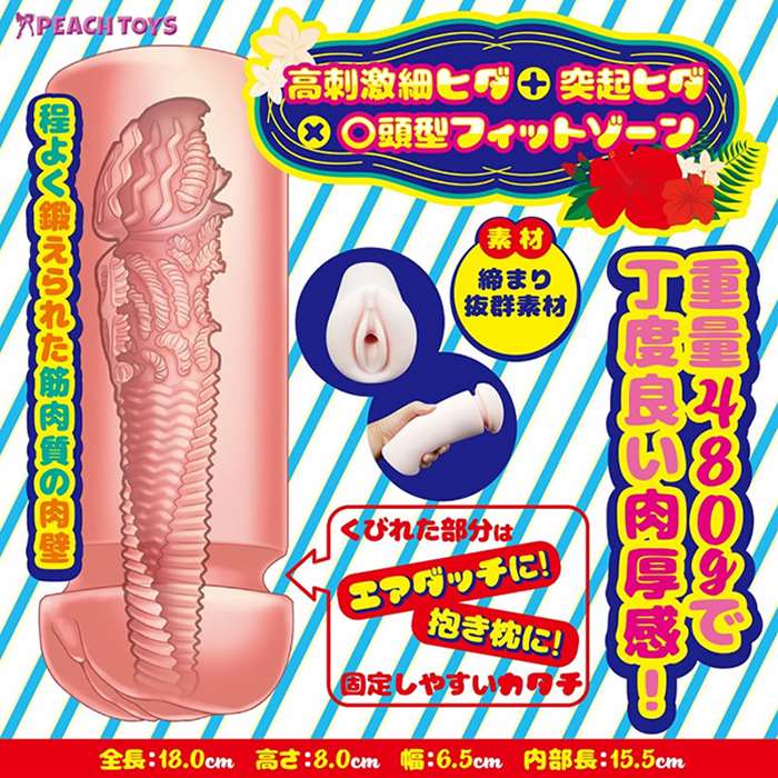 燦々と降り注ぐ太陽とビーチではじける笑顔!締め付け抜群のアソコを持つという美女のアソコを再現したオナホール!!3面横ヒダトルネードで激しく刺激。三角穴が、ストロークする毎にゾリゾリ擦り付けます!後半の突起ヒダ群が亀頭を集中刺激して一気にフィニッシュ!本体サイズ:18.0×Φ8.0cm重量:480gパッケージサイズ:18.5×12.0×8.0cm