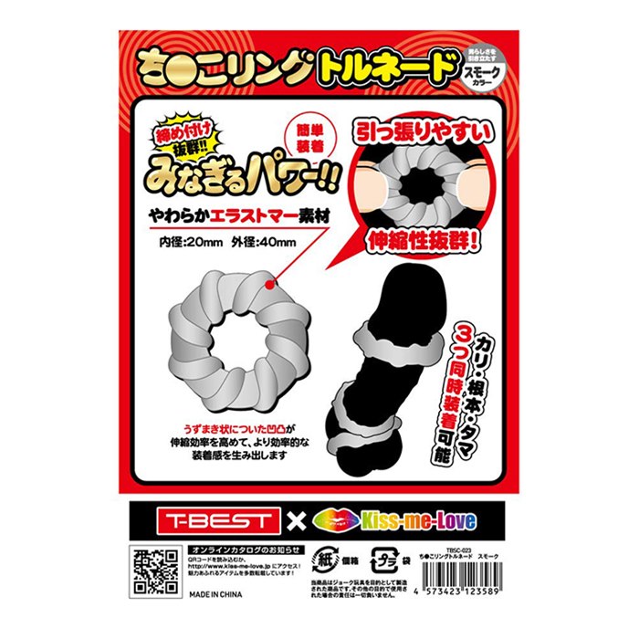 夜もがんばリング、で大人気のやわらかメンズリング「ち●こリング」が、トルネードになって新登場!今度のち●こリングは「特殊形状3個セット」!トルネードデザインのリングを、3つもセットにしました!うずまき状に巻き付いた凹凸が、伸縮率を高めてより効率的な装着感を生み出します。合わせて使えば三点同時装着が可能となります!高い耐久性のやわらかエラストマー素材に、引っ張りやすい簡単装着デザイン、男らしさを引き立たせるスモークカラー!締め付け抜群、みなぎるパワー!!リング内径:2.0cmパッケージサイズ:17.0×10.8×3.0cm