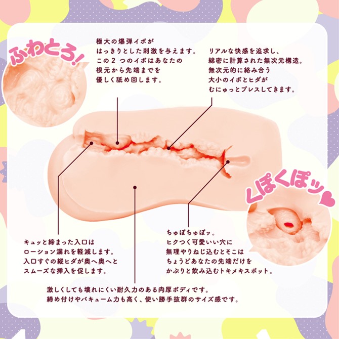 超絶リアル快感のとろける無次元構造オナホール!ふんわりとろける爆弾イボがむにゅっとプレス!ずっしり肉厚な重量約400gのぷっくり可愛いトルソー型で興奮度MAX!柔肌素材で伸縮性抜群!荒々しく無次元に波打つリアルな肉壁は、挿入する向きによって刺激が超変化!内部構造の最奥はあなたの先端をちゅぽちゅぽと飲み込むトキメキスポット!直接肌に触れるものだから、国産素材&国内生産。本体サイズ:14.0×Φ7.0cm重量:400gパッケージサイズ:17.5×12.0×8.0cm