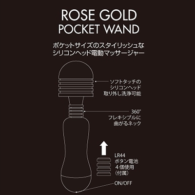 ポケットサイズのスタイリッシュな電動マッサージャー。バックに入れていつでもどこでも使えちゃう、ローズゴールドのメッキが高級感をかもし出す豪ジャスなミニデンマ!本体サイズ:11.7×Φ2.6cm電池:単4×1パッケージサイズ:13.0×5.0×3.5cm